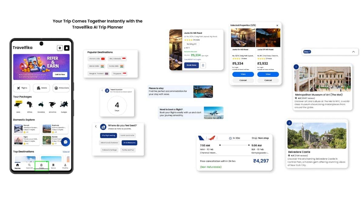 Travelfika is a next-generation travel app built for travellers who want planning, booking, and exploration in one seamless platform. It combines AI-powered travel assistance, smart trip planning, tour packages, and secure bookings, making travel simple and stress-free.