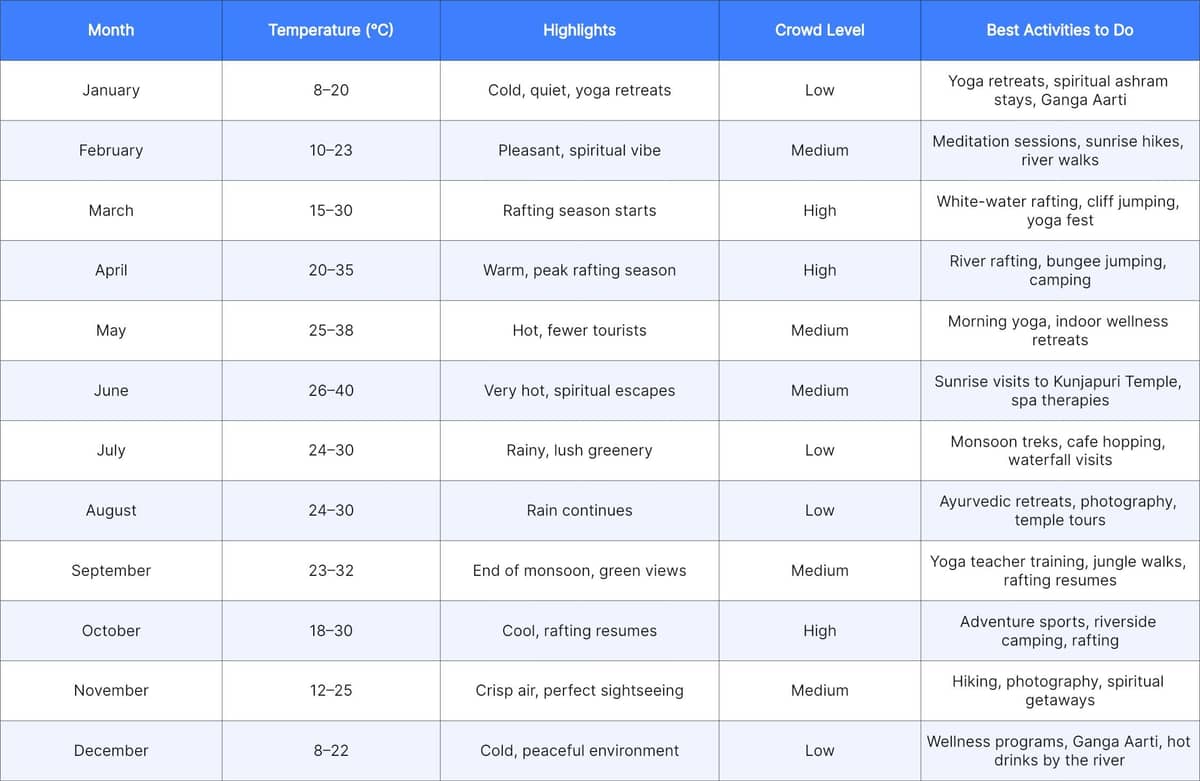 Best Months: March to mid-May, October to November Spring and post-monsoon are the best time to visit Rishikesh for adventure enthusiasts. The river flow is optimal, and the weather is just right for adrenaline-pumping activities without extreme heat or rainfall interruptions.