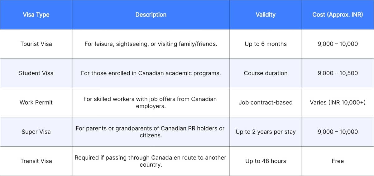 Types of Canada Travel Visas for Indian Citizens