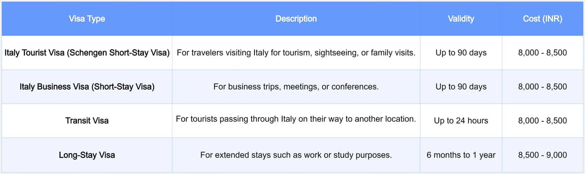 The type of Italy visa you need depends on your travel purpose and duration. Below are the common visa types for Indian travelers: