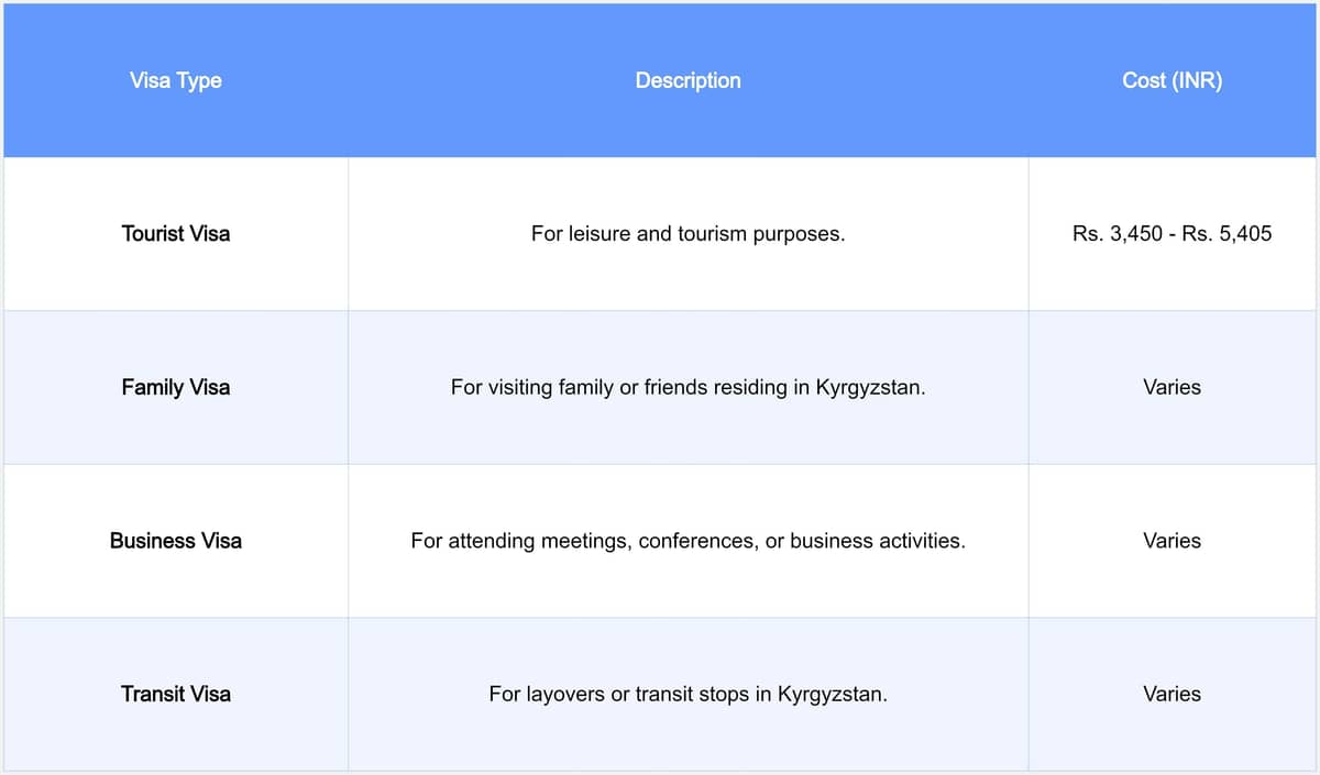 The type of Kyrgyzstan visa you need depends on your purpose of visit. Below are the available visa types: