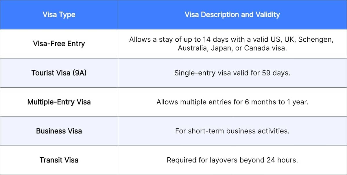 Ensure you have a valid US, UK, Schengen, Japan, Australia, or Canada visa.