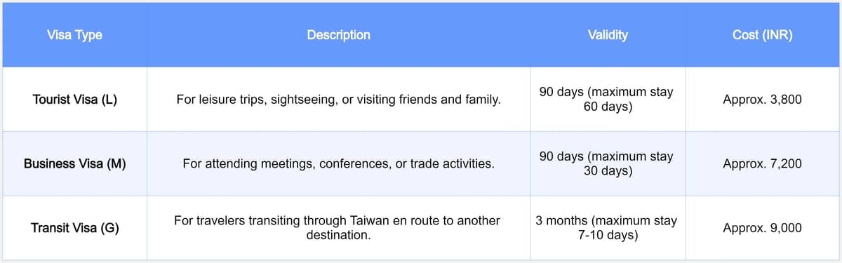 The type of Taiwan visa you require depends on your purpose and duration of stay. Below are the available visa types: